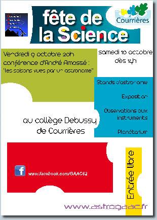 Les vendredi 9 et samedi 10 octobre prochain, le Groupement d’Astronomes Amateurs Courriérois organisera pour la cinquième fois la Fête de la Science sur la commune de Courrières.